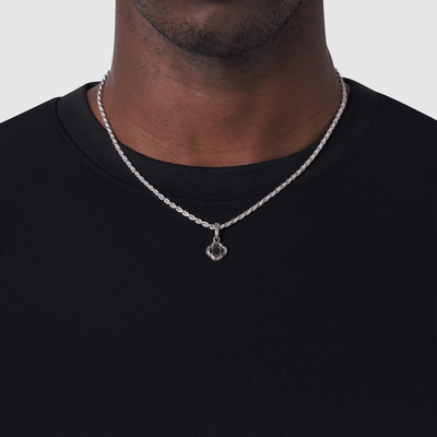 This sterling silver pendant features a polished onyx clover framed by a fluid molten bezel. Cast exclusively from precious metals, it carries a weight and presence you feel the moment it rests against your chest. The details are smooth, the polish runs deep, and it reflects the light in a way only real silver can. Pair it with any matching sterling silver chain, or wear it on your existing chains up to 2mm in width.